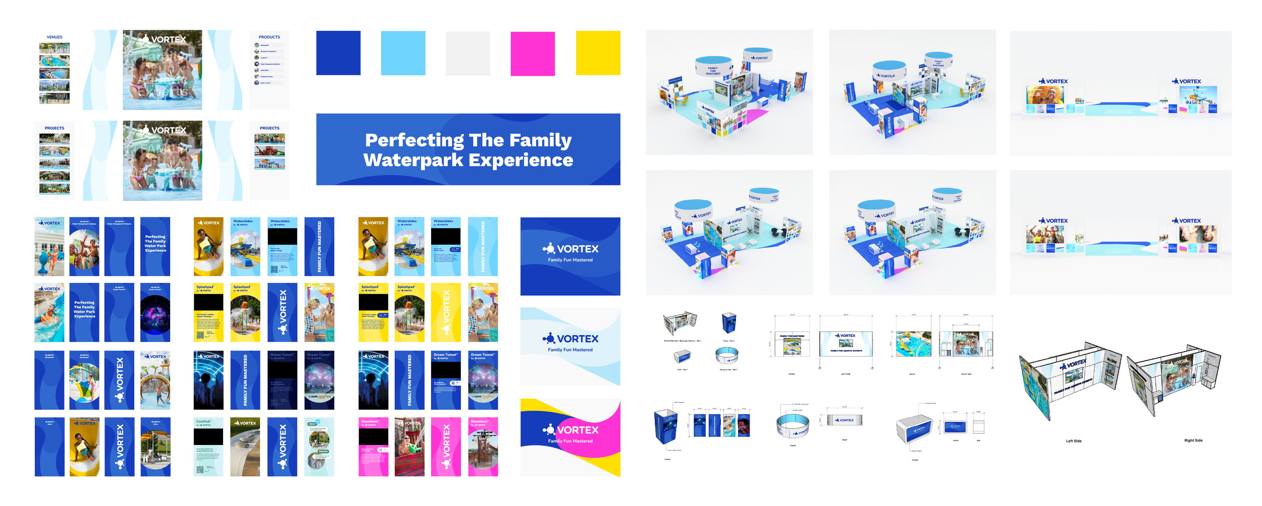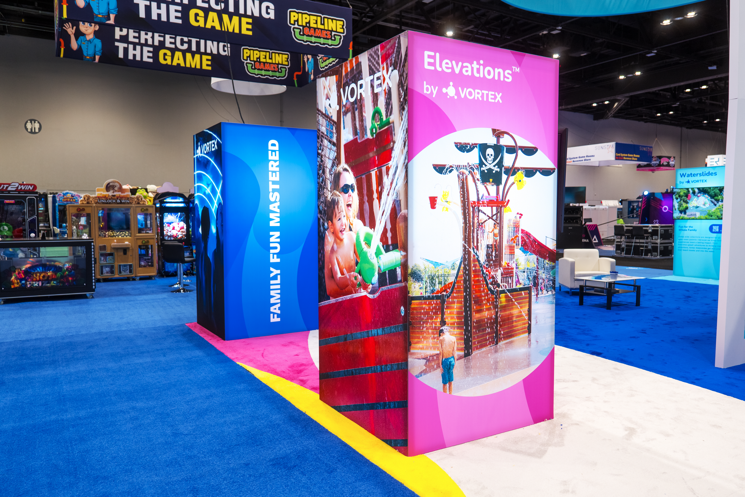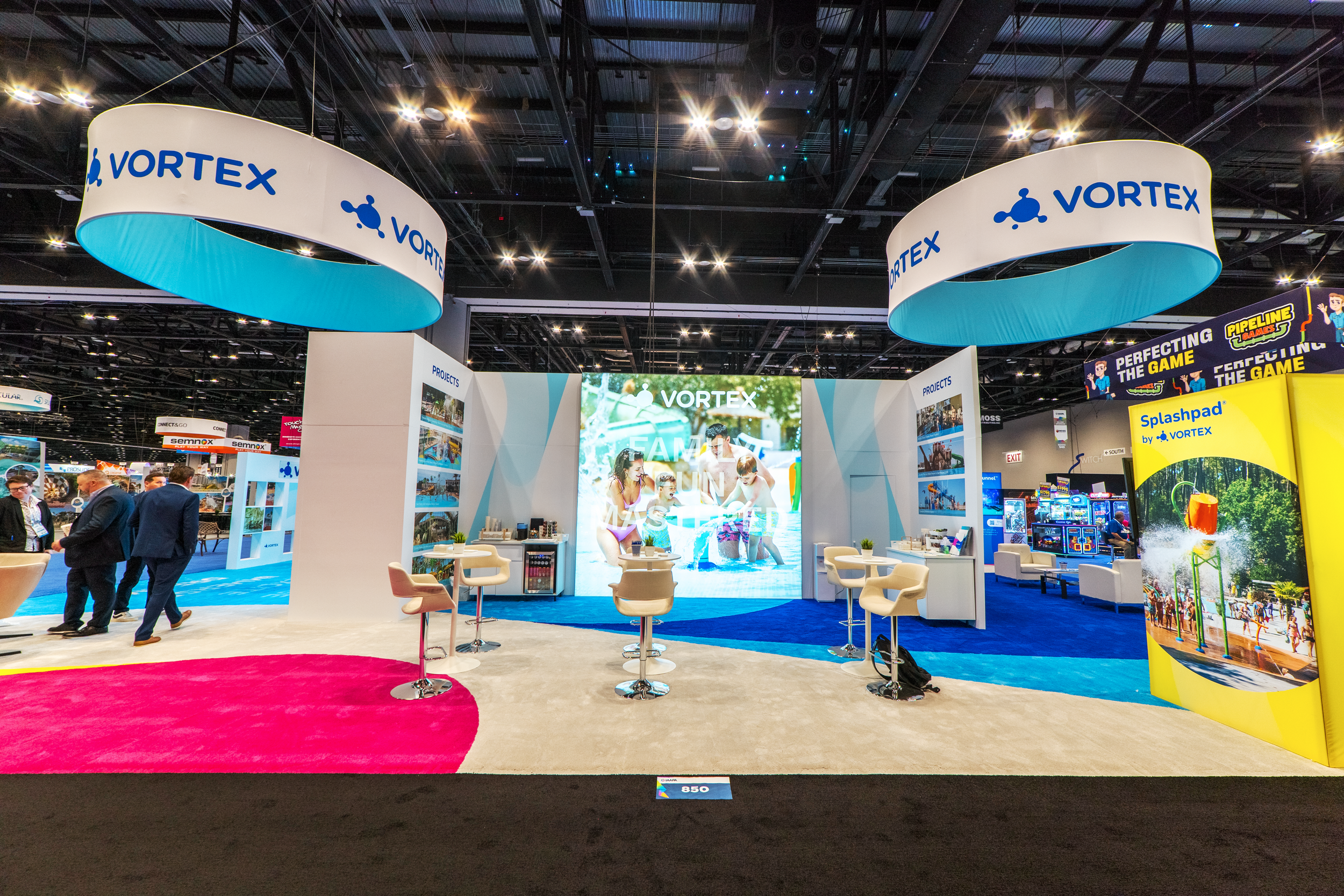 Vortex Aquatic Structures’ booth at the 2024 IAAPA Expo was designed to capture the essence of the brand—bringing family fun and connection to every waterpark experience. The space combined a clean, modern aesthetic with vibrant pops of color that reflected Vortex’s playful spirit. The booth captivated attendees with an 8-foot LED screen at the entrance, an impressive 12-foot lightbox, and a custom inlay carpet.